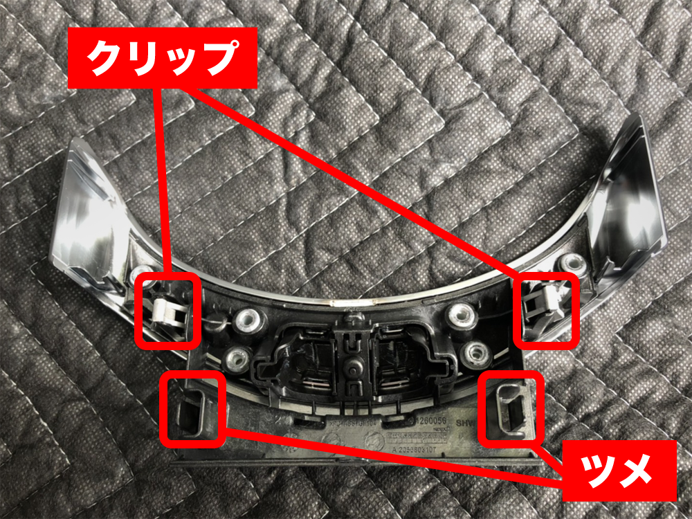 内側のツメのクリップが外れている場合がありますので、しっかりと取り付けておきます。