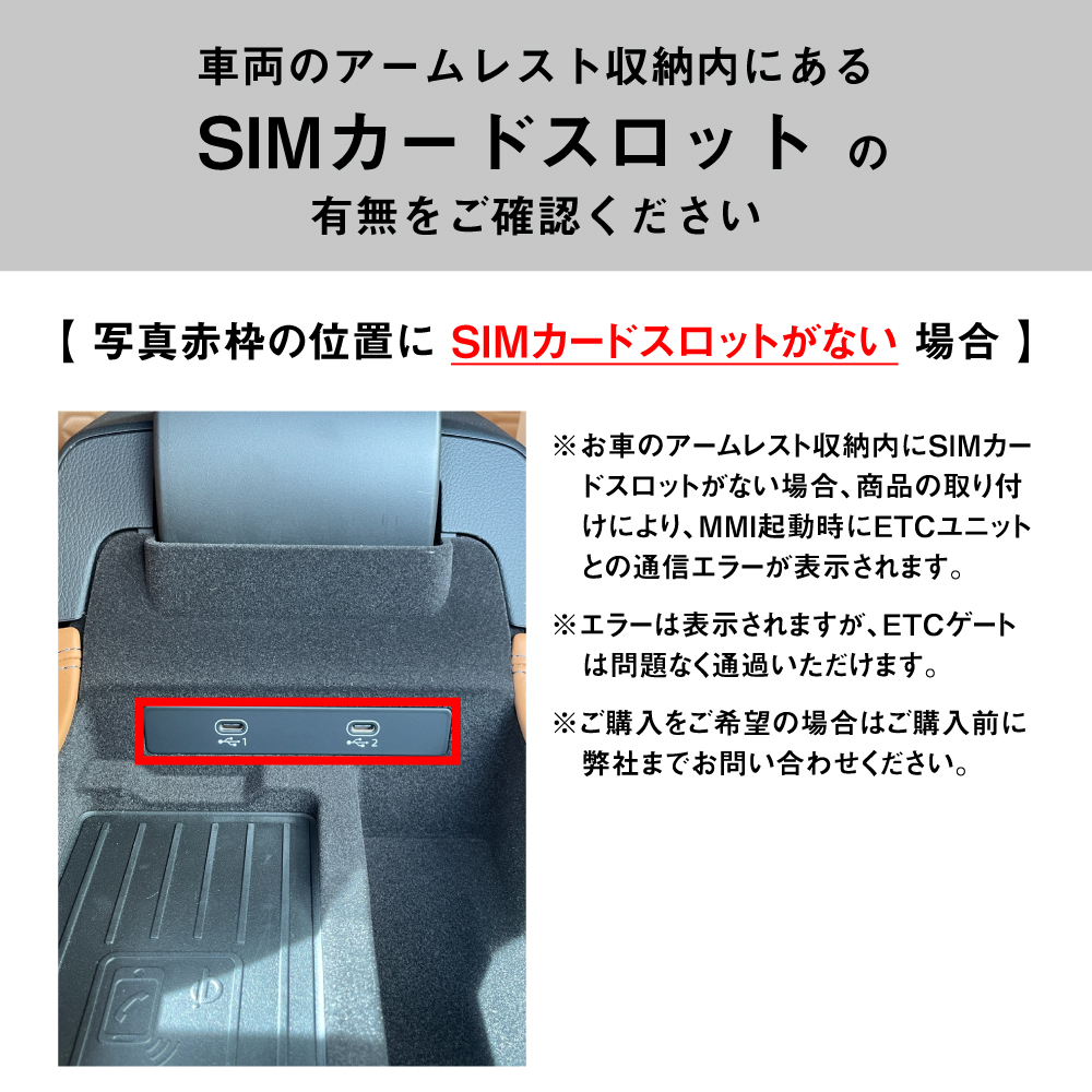 ・お車のアームレスト収納内にSIMカードスロットがない場合、商品の取り付けにより、MMI起動時にETCユニットとの通信エラーが表示されます。